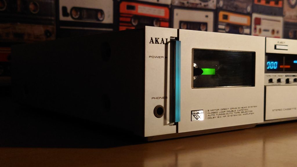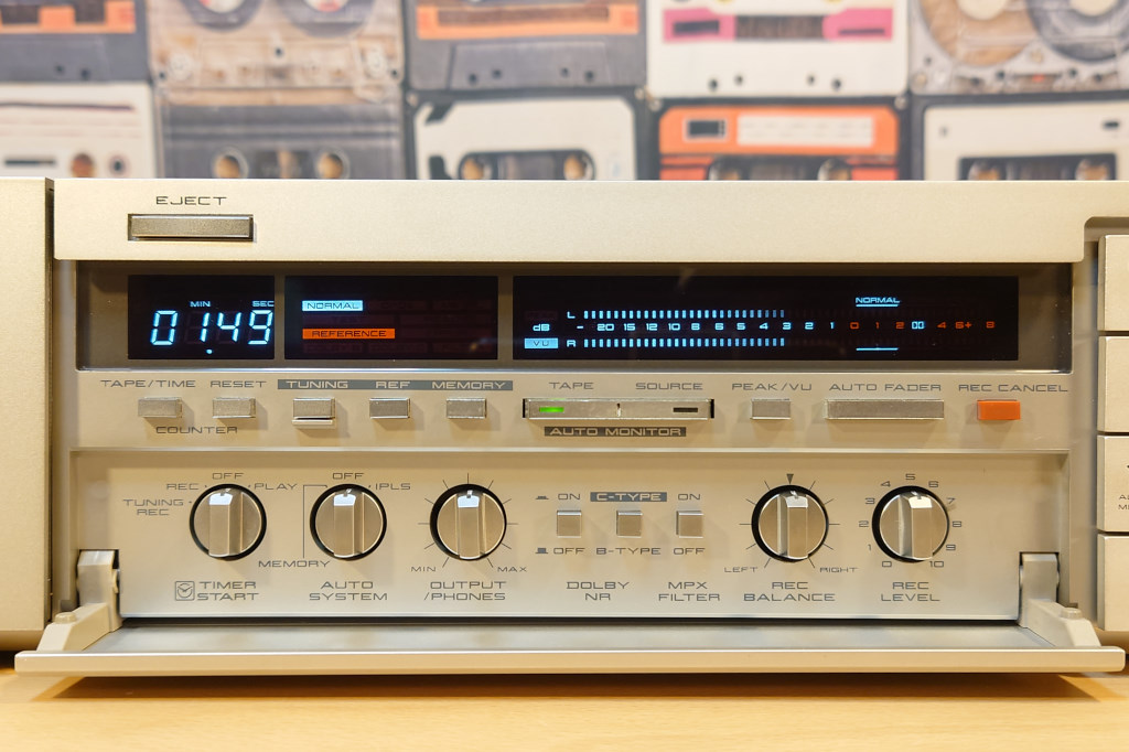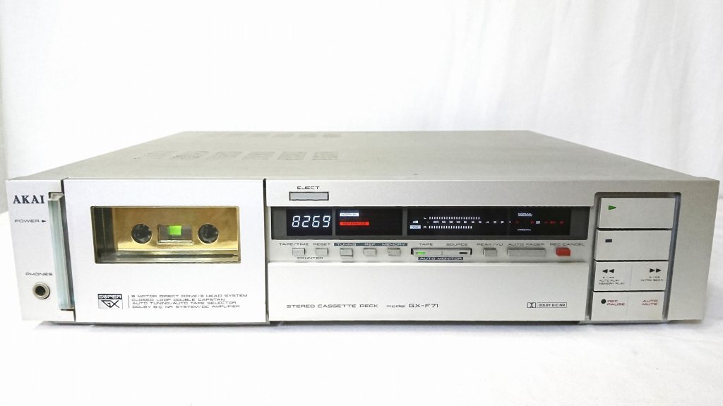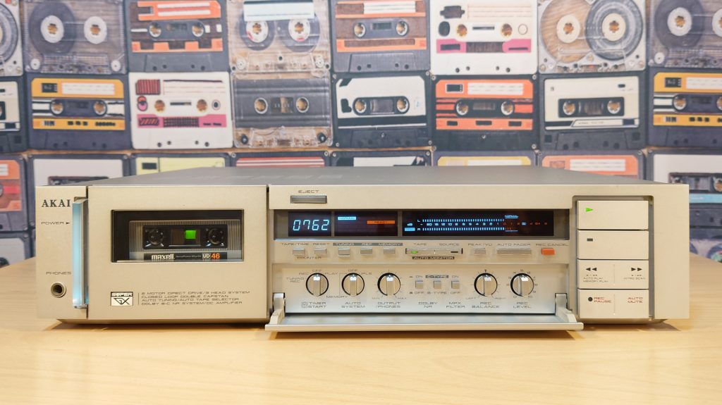 1982年に発売された3ヘッド方式の中堅モデルです。これまではごつごつした印象だったAKAIのカセットデッキですが、一転スタイリッシュな容姿になっています。