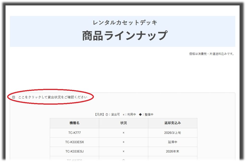 商品ラインナップを開いたすぐの場所に、各機種の貸出状況を掲載しています。「ここをクリックして…」の部分をクリックすると一覧表が表示されますので、ご注文前にご確認をお願いします。